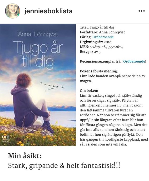 Omdömen, Recension, Roman, Roman 2, Tjugo år till dig, UppföljareJennies boklista har läst ”Tjugo år till dig” juni 8, 2016 Anna Lönnqvist Och tycker att den är ”stark, gripande och helt fantastisk”. Så glad! Tack snälla. ❤ Dela detta: Dela på X (Öppnas i ett nytt fönster) X Dela på Facebook (Öppnas i ett nytt fönster) Facebook Gilla Laddar in … Relaterade Publicerad av Anna Lönnqvist Visa alla inlägg av Anna Lönnqvist